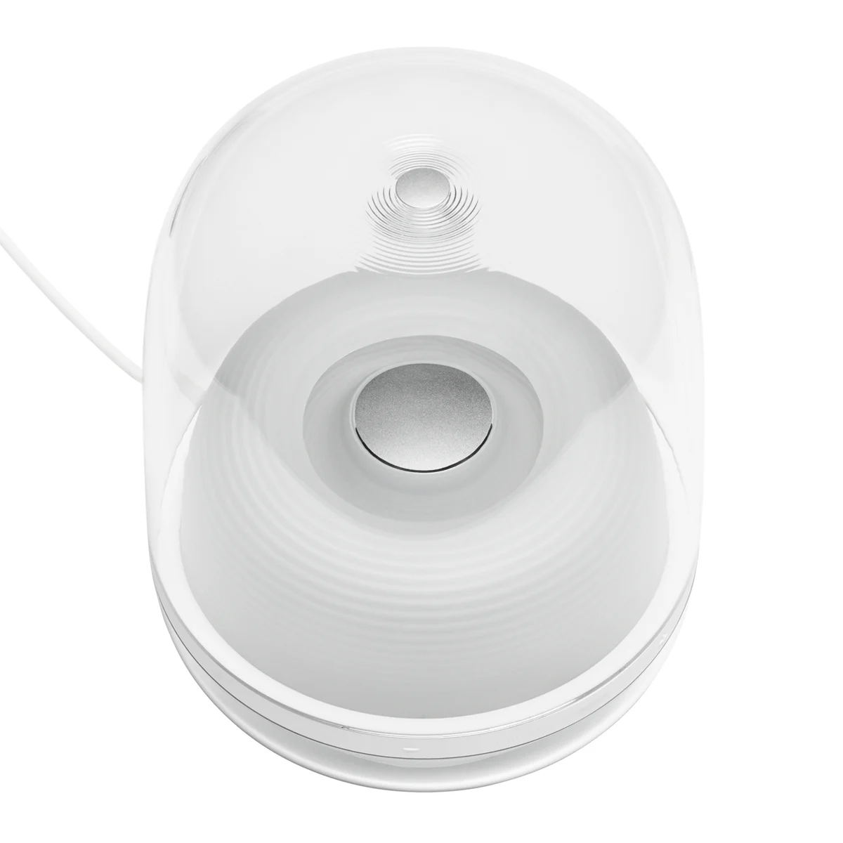 • طراحی شفاف و کریستالی: بدنه شفاف و گنبدی‌شکل ساب‌ووفر و اسپیکرهای اقماری (Satellites)، اجازه می‌دهد تا ساختار مهندسی داخلی دستگاه به زیبایی نمایان باشد. این طراحی باعث می‌شود اسپیکر با هر نوع دکوراسیونی، از مدرن تا کلاسیک، هماهنگ شود.