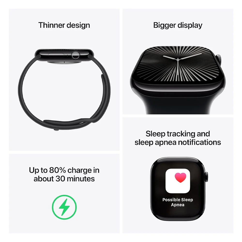 ساعت هوشمند اپل مدل Series 10 با ابعاد ۴۲x۳۶x۹.۷ میلی‌متر و وزن ۲۹.۳ گرم، محصولی مناسب برای آقایان و بانوان است که هم در فعالیت‌های روزمره و هم در موقعیت‌های رسمی و ورزشی قابل استفاده است. جنس بدنه این ساعت از آلومینیوم بوده و در ساخت آن از شیشه Ion-X و سرامیک سافایر بهره گرفته شده است. صفحه نمایش ۱.۷۷ اینچی آن از نوع Retina LTPO3 OLED با وضوح ۳۷۴x۴۴۶ پیکسل و تراکم ۳۳۰ پیکسل بر اینچ بوده که قابلیت روشنایی بین 1 تا 2000 نیت را دارد. این ساعت با سیستم عامل WatchOS نسخه 11 و پردازنده Apple S10 عرضه شده و از فناوری‌های مکان‌یابی GPS، A-GPS، GLONASS، GALILEO، BDS و QZSS پشتیبانی می‌کند.
