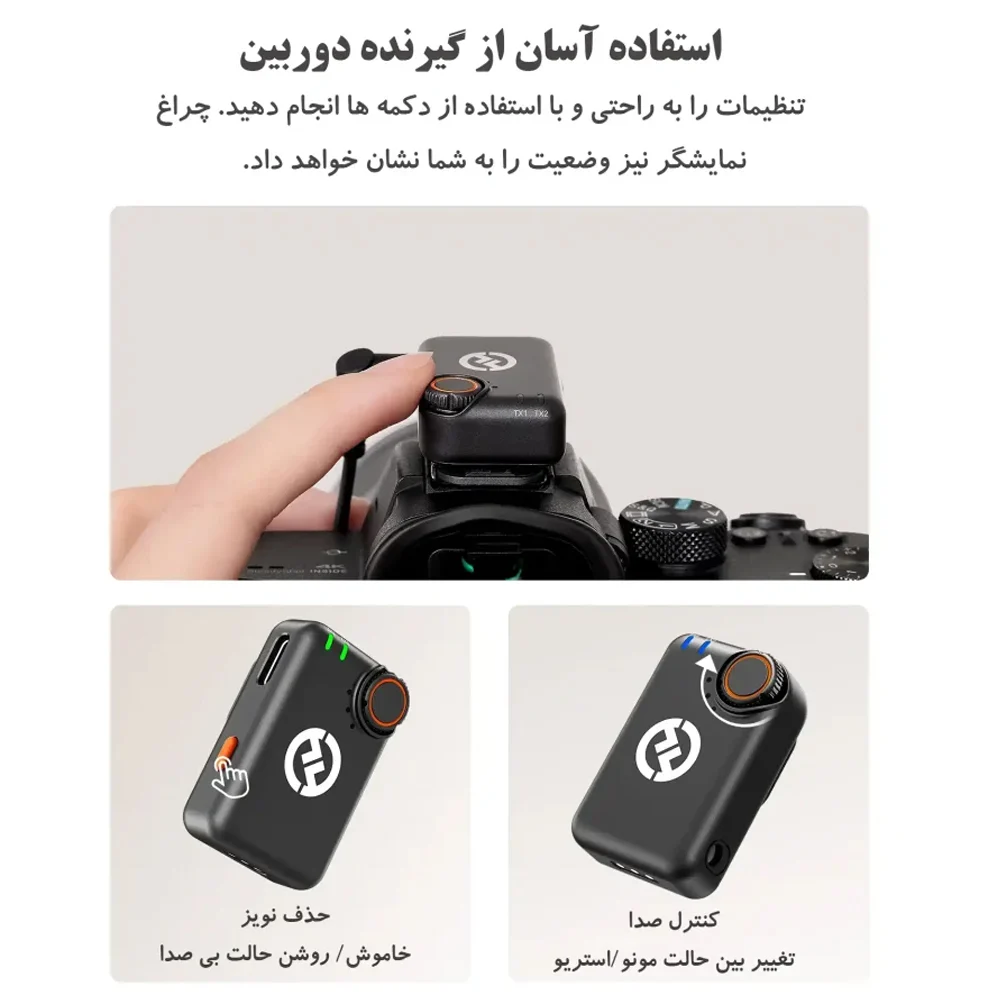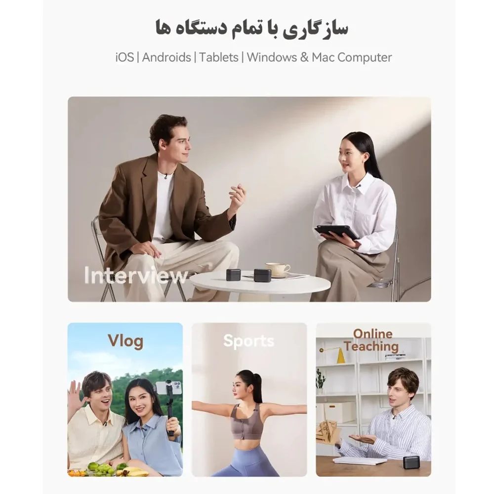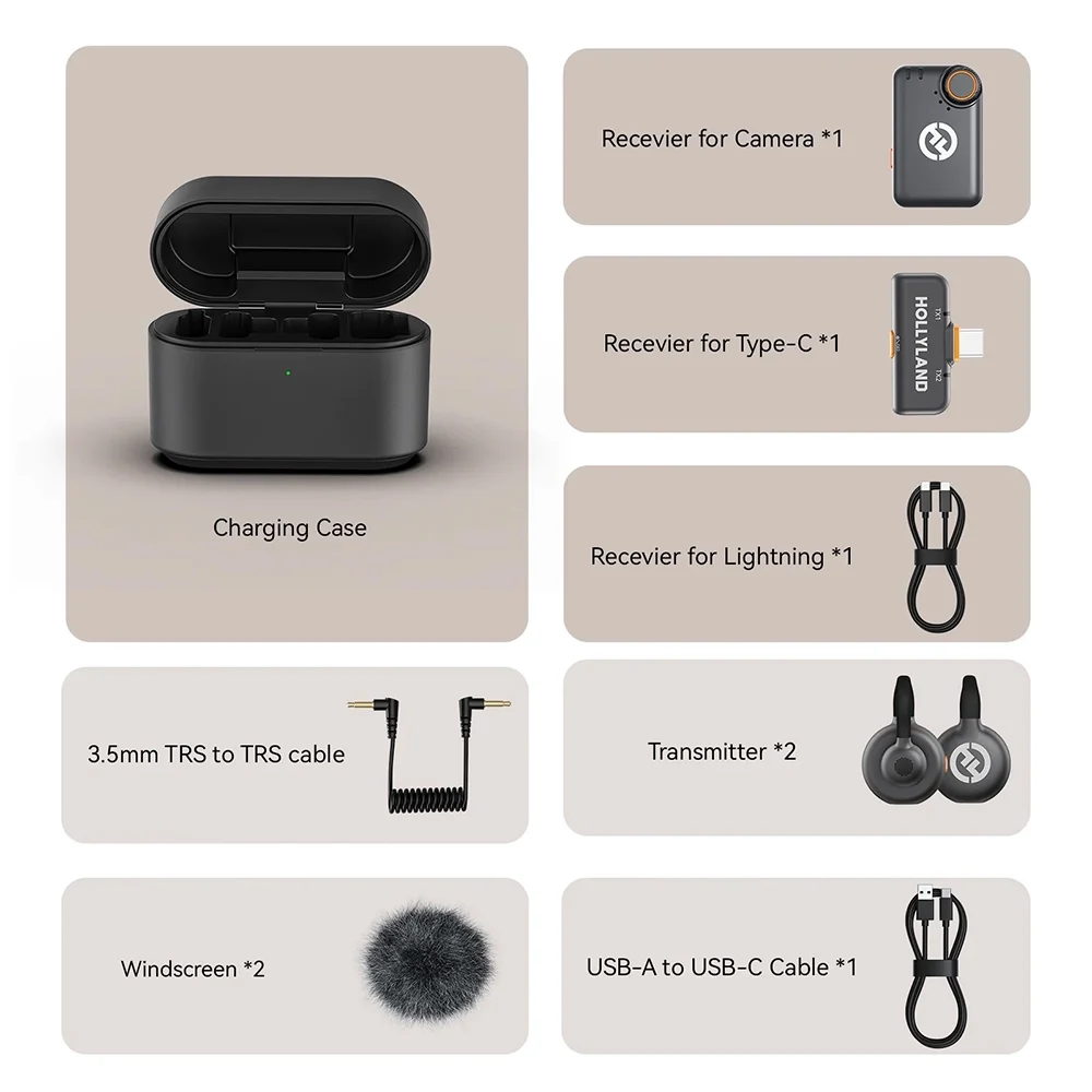 2 عدد فرستنده 1 عدد گیرنده USB-C 1 عدد گیرنده دوربین کیس شارژ کابل 3.5mm TRS (اتصال به دوربین) کابل شارژ USB-A به USB-C کابل USB-C به لایتنینگ 2 عدد خز بادگیر