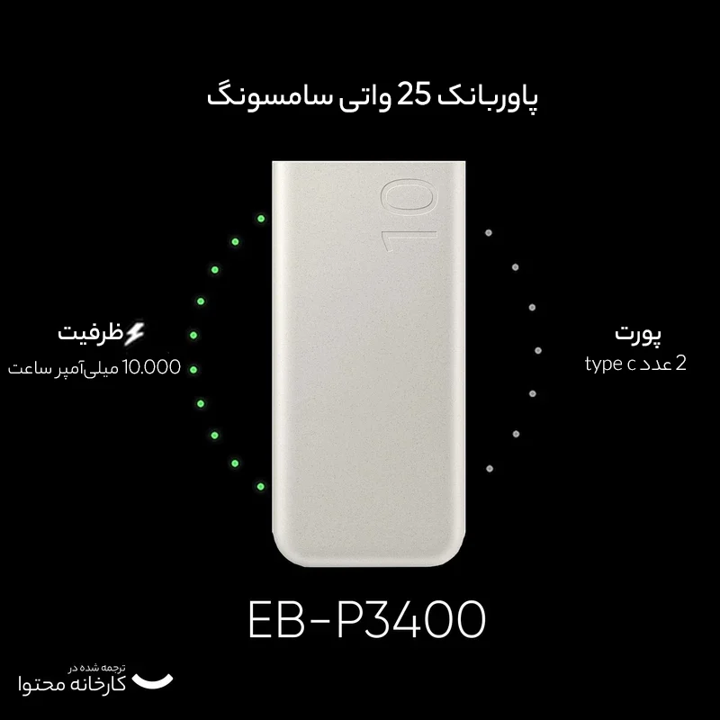 پاوربانک سامسونگ مدل eb-p3400 ظرفیت ۱۰۰۰۰ میلی آمپر پاسخی حرفه‌ای به نیاز روزافزون کاربران برای دسترسی به شارژ پرسرعت در طول روز است. این شارژر همراه با طراحی ساده، شیک و ضخامت کم ۱۵.۶ میلی‌متر، به راحتی قابل حمل است. مهم‌ترین نقطه قوت این مدل، پشتیبانی از فناوری سوپر فست شارژ ۲۵ وات است که عملکردی کاملاً مشابه با شارژرهای دیواری قدرتمند سامسونگ را فراهم می‌کند.
